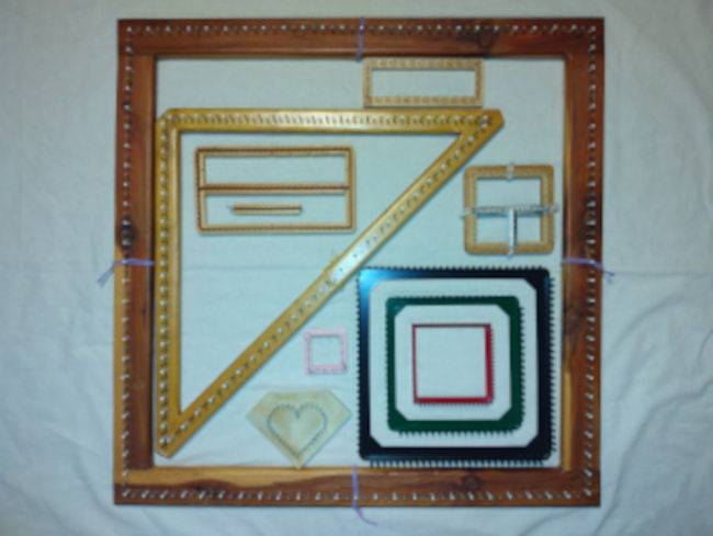 A pin loom is a frame with pins (or nails) in a continuous row all the way around the loom. There are some general guidelines in that squares, triangles and hexagons will have the same number of nails on each side and a rectangle will have a multiple # of pins on the long sides as the short side, but this does not always hold depending on the maker and their views.